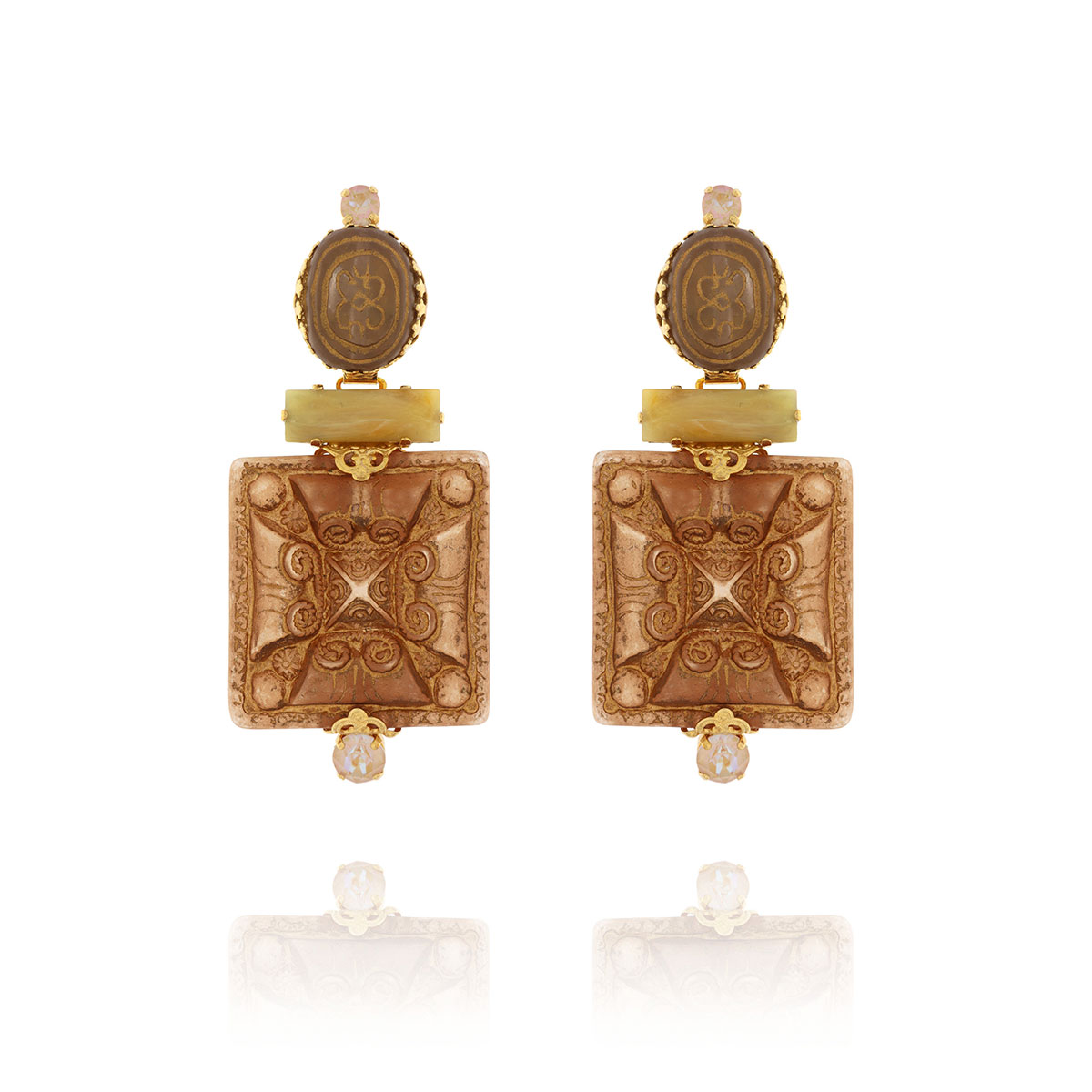 These sculptural earrings are made by resin material, inspired in the tribal African symbols, African jewelry and ritual dances. A ivory baguette stone holds the two parts of the earrings together. Melt caramel squared resin and a cappuccino oval resin bed give a native attitude. Pin or clip fastening. All of our products are made with care in our NF workshop in Greece.